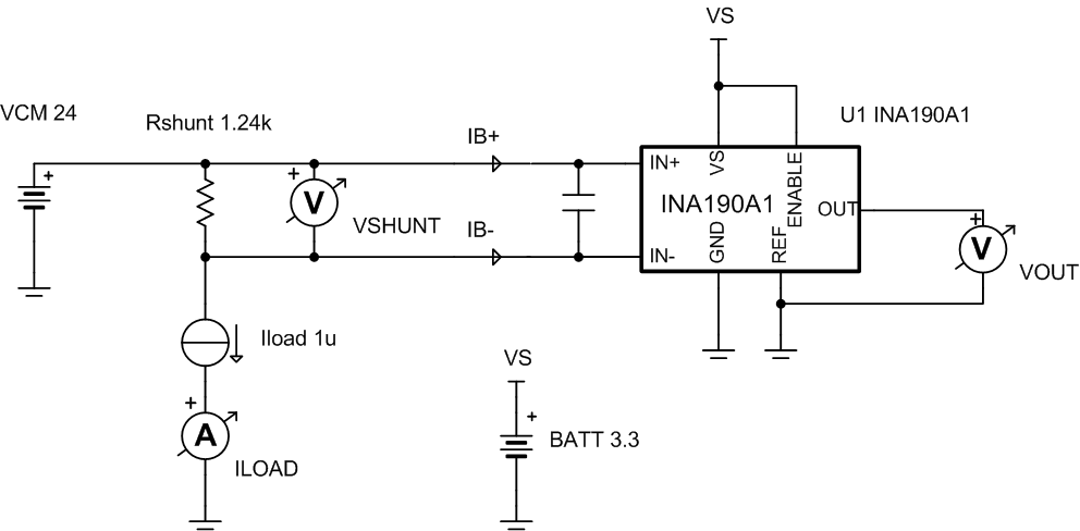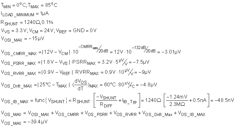 - 根據(jù)設(shè)計(jì)要求,驗(yàn)證分流電阻器是否在 1μA 負(fù)載電流下實(shí)現(xiàn) 3.51% 的最大總誤差。假設(shè)所有偏移和增益誤差都是負(fù)值。請注意,輸入偏置電流 (IIB) 引起的誤差是 VSHUNT 和輸入差分阻抗 (RDIFF) 的函數(shù),其中 RDIFF = IIB+/VDIFF。由于 IIB- 的起始值為大約 +500pA,然后會(huì)隨著 VSHUNT 的增大而減小,因此這會(huì)產(chǎn)生負(fù)輸入偏移誤差。請參閱數(shù)據(jù)表中的 IB+ 和 IB- 與差分輸入電壓間的關(guān)系 圖。