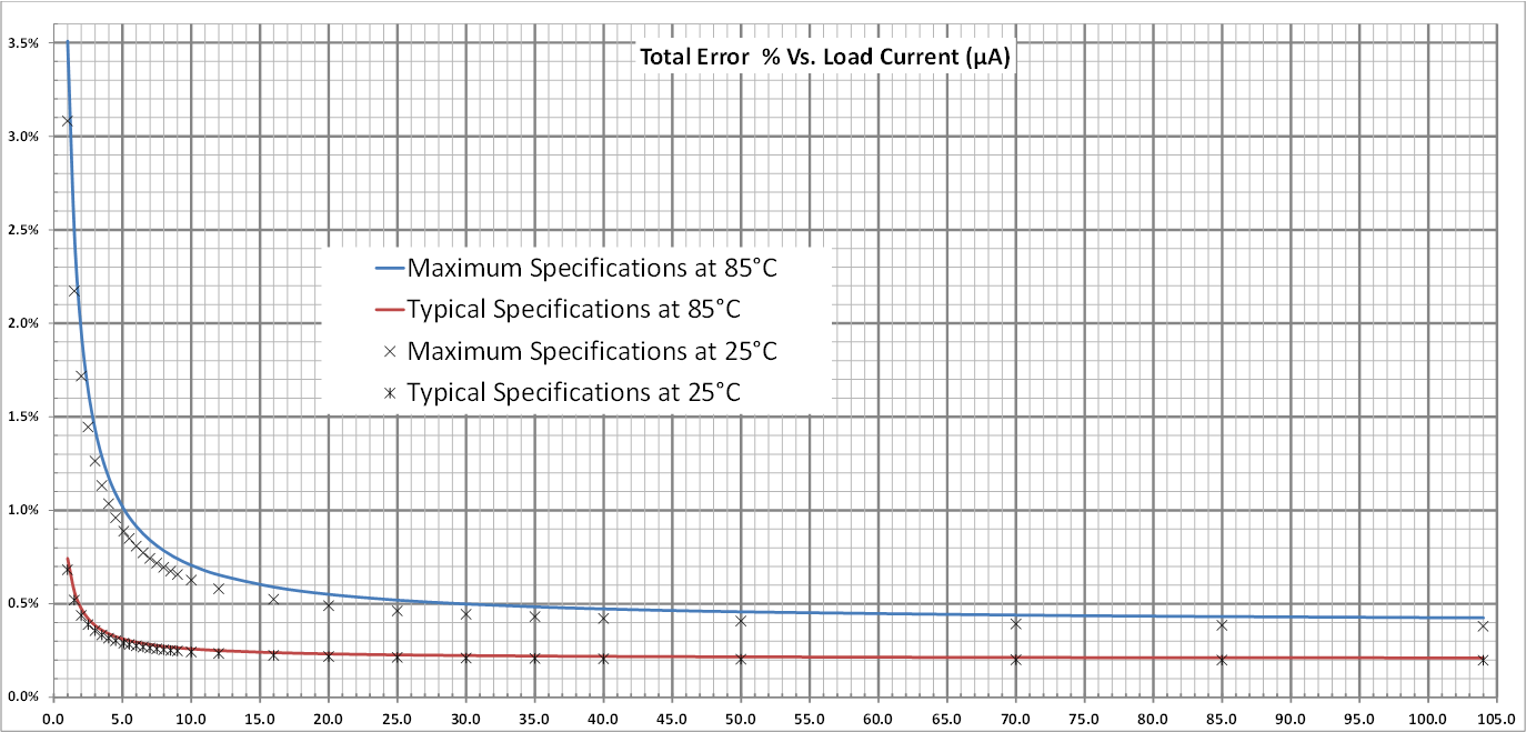 - 根據(jù)第 1 步中的總誤差公式生成總誤差與負(fù)載電流間的關(guān)系 曲線。針對典型和最大產(chǎn)品說明書規(guī)格執(zhí)行此操作。