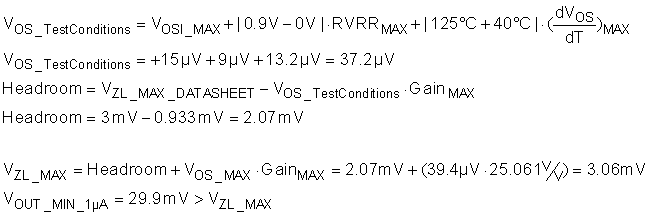 - 驗(yàn)證檢測到的電流范圍是否符合器件的輸出動(dòng)態(tài)范圍。這取決于兩種規(guī)格:擺幅至 VVS (VSP) 和零電流輸出電壓 (VZL)。VZL 是在 -40°C 至 +125°C 溫度、VVS = 1.8V、VREF = 0V、VSENSE = 0mV、VCM = 12V 和 RL = 10kΩ 的條件下指定的。由于數(shù)據(jù)表?xiàng)l件與此設(shè)計(jì)的條件不匹配,因此推斷最大 VZL 值。