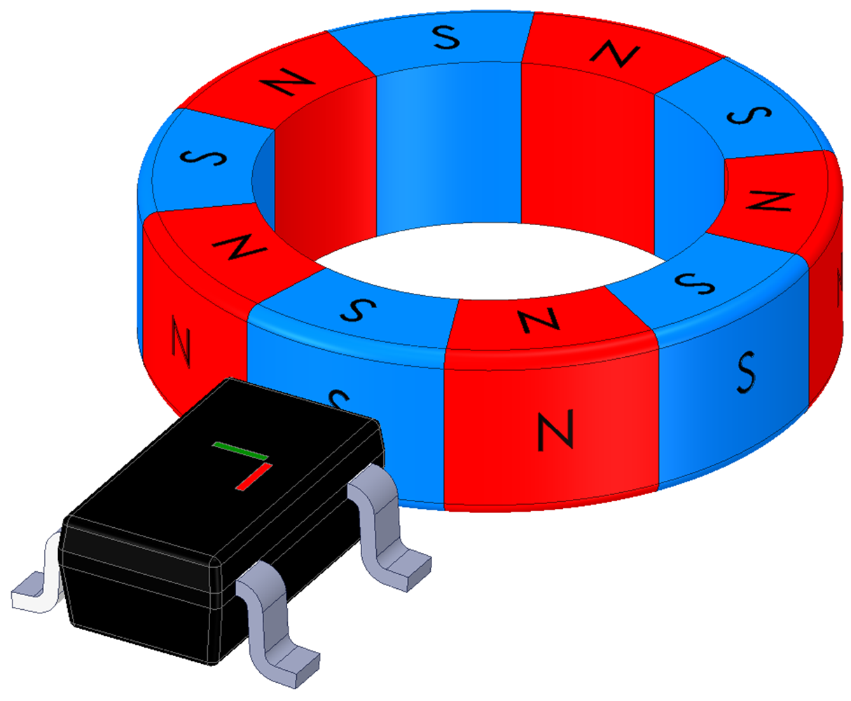 旋轉(zhuǎn)感應(yīng)的另一種霍爾實現(xiàn)方式是作為編碼器。該方法通過霍爾傳感器(通常是霍爾效應(yīng)鎖存器)上的過渡磁場極性來觀察旋轉(zhuǎn)變化。它們在功能上類似于機械旋轉(zhuǎn)編碼器,但去除了會導(dǎo)致磨損的機電觸點。實現(xiàn)這一點的一種常見方法是在編碼器中使用具有多個磁極的環(huán)形磁體。當(dāng)磁極移動并且磁傳感器上方的磁場從北極切換到南極或從南極切換到北極時,開關(guān)或鎖存器的輸出可用來顯示旋轉(zhuǎn)運動的變化。開關(guān)會為磁場的兩極提供輸出,而鎖存器會在磁場極性變化時改變輸出狀態(tài)。TMAG5110 是一款 2D 鎖存器,可為磁場的 X 和 Y 分量提供單獨的輸出。與單個 1D 鎖存器相比,該過程會提供磁體旋轉(zhuǎn)的正交輸出,從而可以得出旋轉(zhuǎn)方向和更多的輸出狀態(tài)。