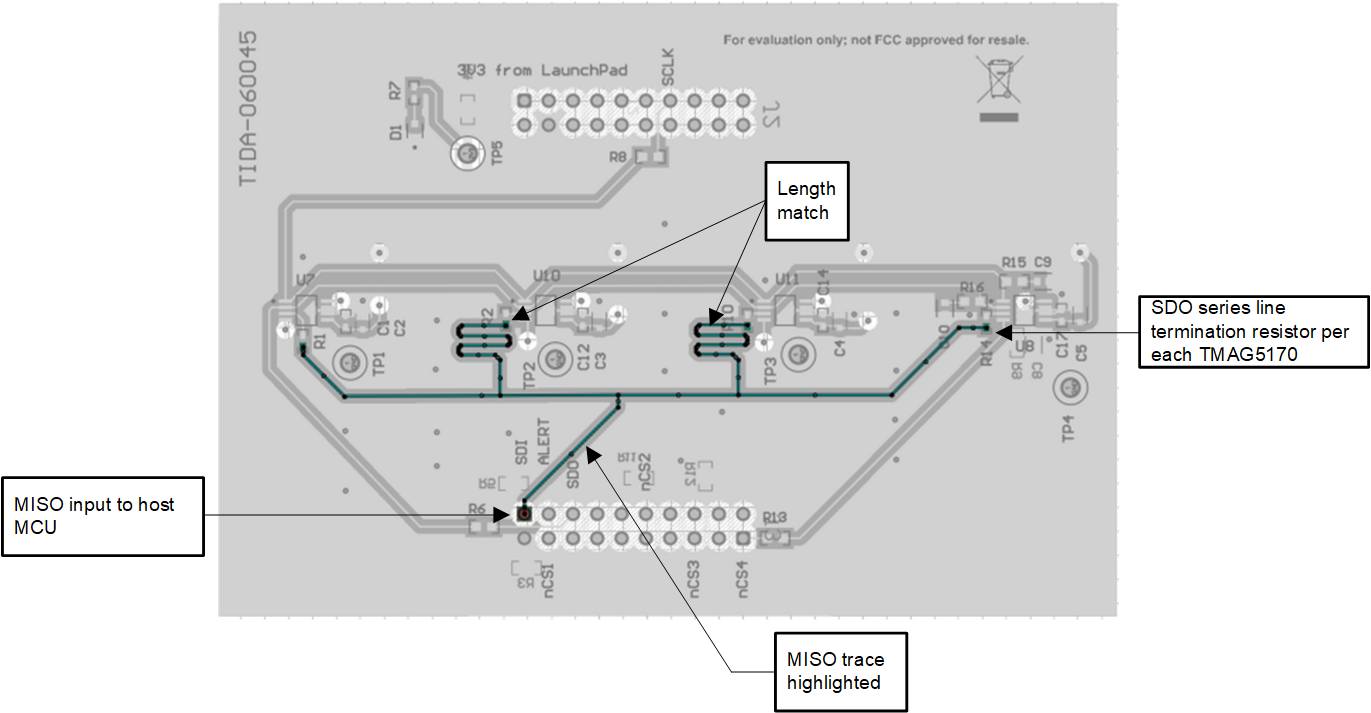 每個(gè) TMAG5170 的單獨(dú) SDO 輸出 (SPI MISO) 都有一個(gè)串行線路端接電阻器。每個(gè) TMAG5170 的四條 SDO 跡線以星型方式布線,長度相似,然后合并為單條跡線以連接到主機(jī)處理器 MISO 輸入引腳。