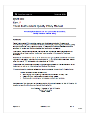 ?質(zhì)量體系手冊(cè)?(QSM),也稱(chēng)作 QSM000,伴隨質(zhì)量體系產(chǎn)生,定義了用于確保產(chǎn)品和服務(wù)符合客戶(hù)要求及國(guó)際國(guó)內(nèi)標(biāo)準(zhǔn)的政策與規(guī)程。QSM 規(guī)定了實(shí)施質(zhì)量管理體系和質(zhì)量政策的具體活動(dòng)的相關(guān)工作說(shuō)明和流程,旨在樹(shù)立質(zhì)量和可靠性標(biāo)桿并實(shí)現(xiàn)卓越經(jīng)營(yíng)。它廣泛運(yùn)用于從事 TI 半導(dǎo)體產(chǎn)品設(shè)計(jì)、制造和服務(wù)支持的所有 TI 人員。