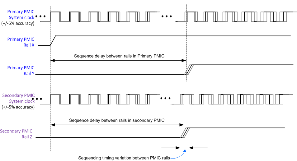ConnectionsThe power sequencer of the multiple PMICs are synchronized at the beginning of each power up and power down sequence; a variation in the sequence timing, however, is still possible due to the ±5% clock accuracy of the independent system clocks on the primary and secondary PMICs. The worst-case sequence timing variation from different PMIC rails is up to ±10% of the target delay time. Figure 8-45 illustrates the creation of this timing variation between PMICs.