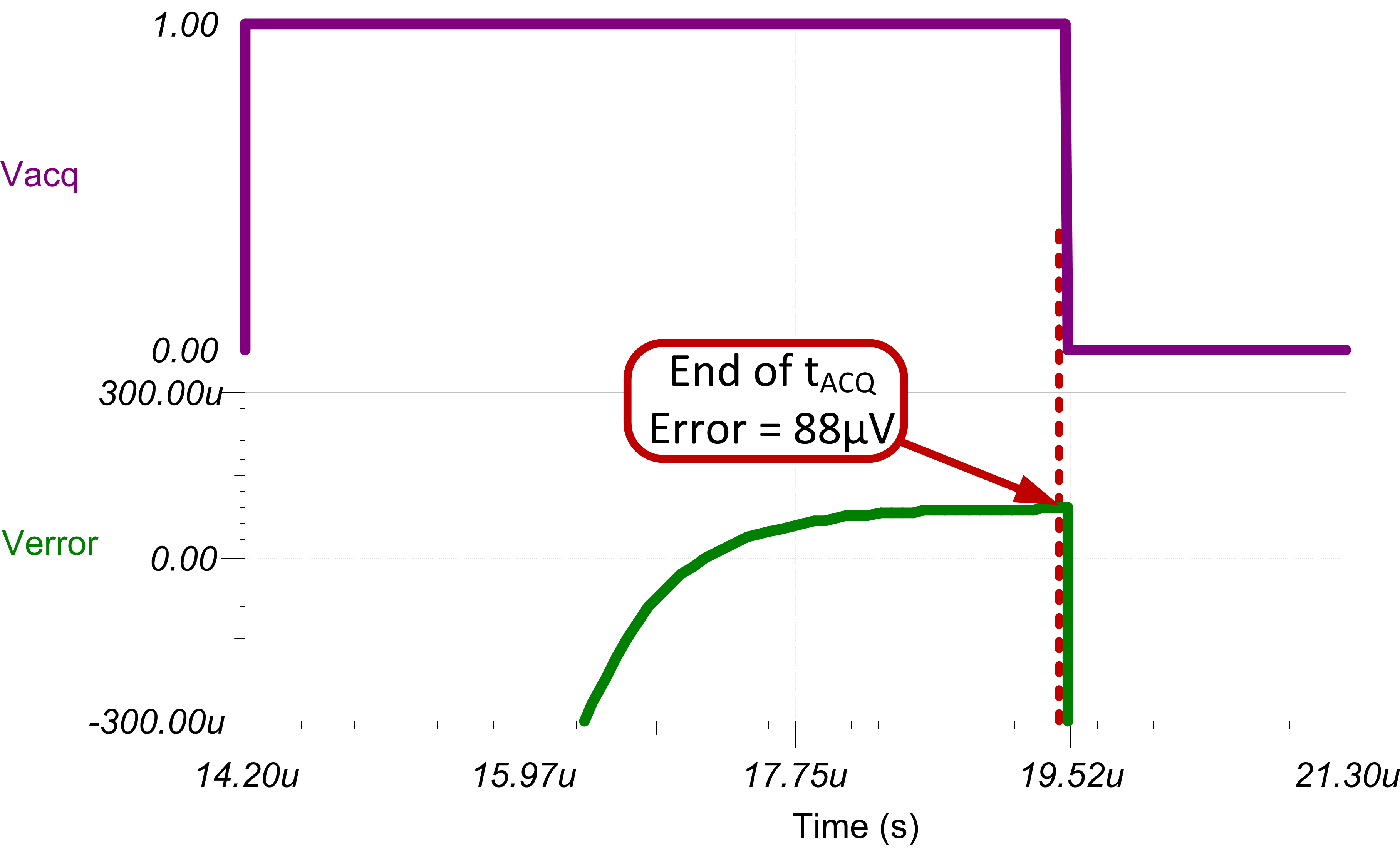 ?? ?????? ?? ??? 5.3μs? ?? ?? ??? ?????. 88μV ??? 0.5 × LSB ??? 403μV ?????. ? ??? ?? ??? ??? Rfilt ? Cfilt ? ???? ??????.