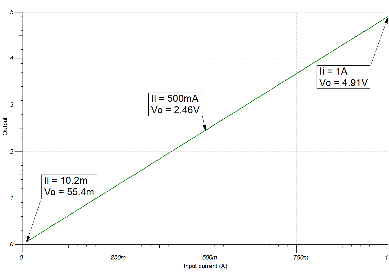 此單電源低側(cè)電流檢測(cè)方法可以準(zhǔn)確地檢測(cè)最大為 1A 的負(fù)載電流,并將其轉(zhuǎn)換為 50mV 至 4.9V 的電壓??梢愿鶕?jù)需要調(diào)節(jié)輸入電流范圍和輸出電壓范圍,并且可以使用更大的電源來(lái)適應(yīng)更大的擺幅。