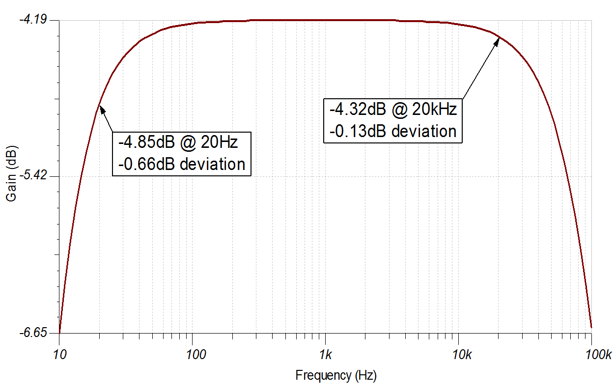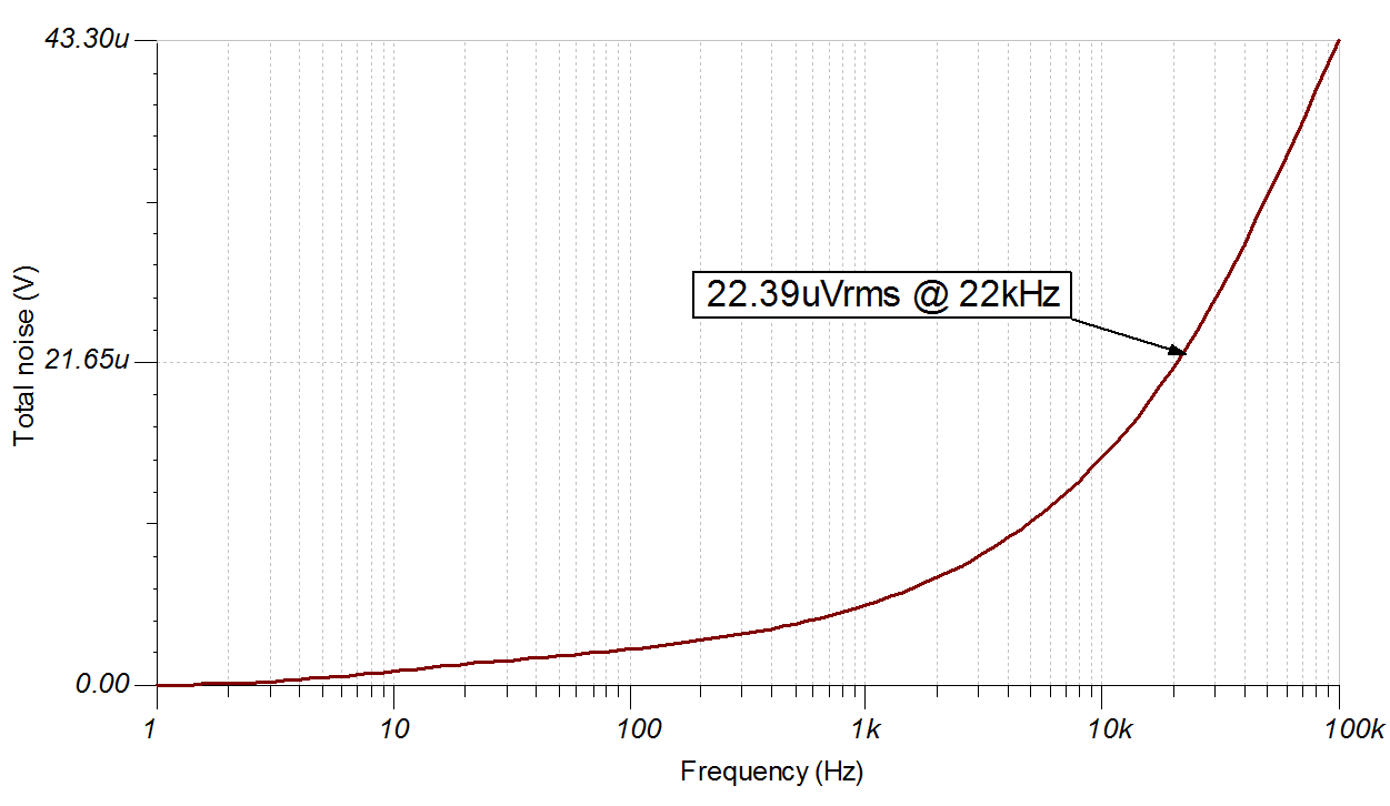以下仿真結(jié)果顯示 22kHz 時(shí)的噪聲為 22.39uVrms。測(cè)量帶寬為 22kHz 時(shí)的噪聲,以表示使用帶寬設(shè)置為 22kHz 的音頻分析儀測(cè)量出的噪聲。