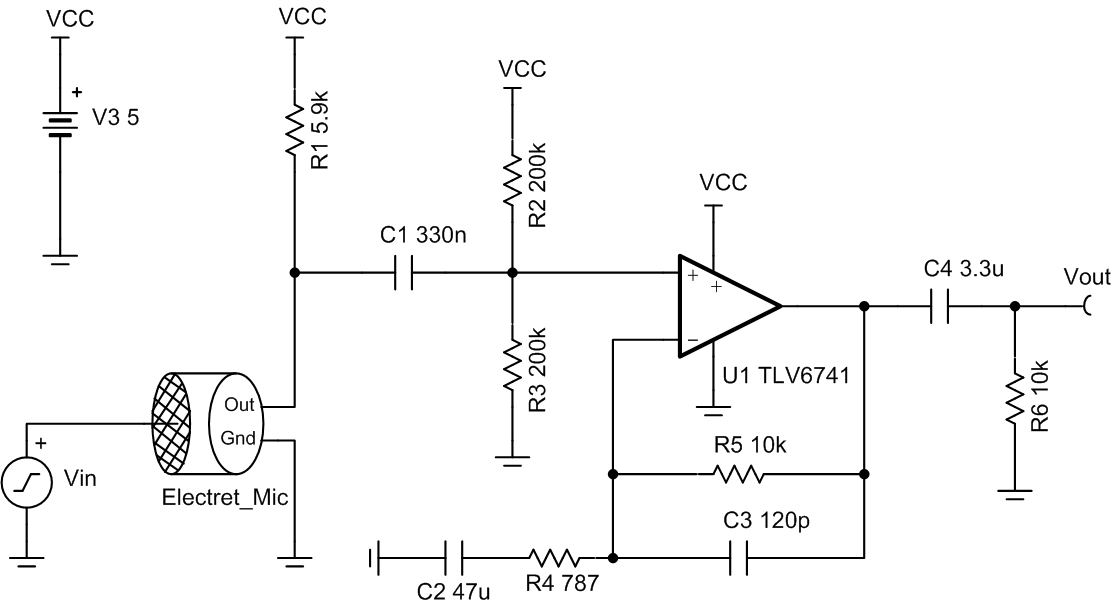 此電路使用同相放大器電路配置來放大麥克風(fēng)輸出信號(hào)。此電路的幅度穩(wěn)定性非常好,在整個(gè)音頻范圍內(nèi)僅具有微小的頻率響應(yīng)偏差。此電路旨在使用 5V 單電源來運(yùn)行。