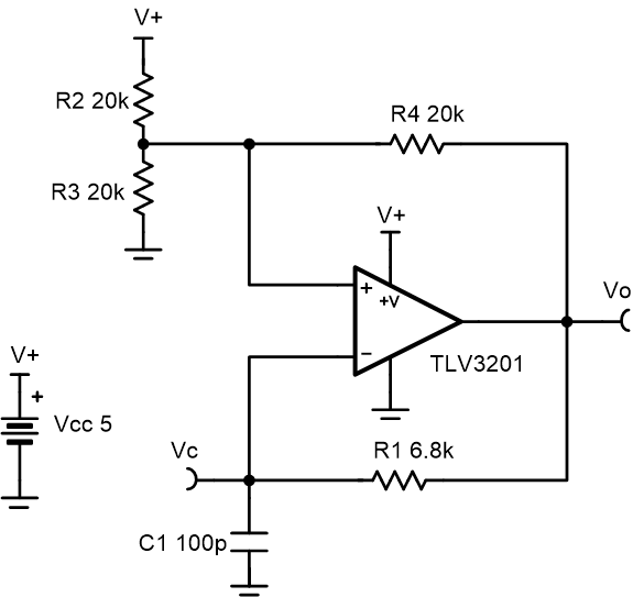 該振蕩器電路以所選的頻率生成方波。這是通過利用電阻器 R1 對電容器 C1 進(jìn)行充電和放電來實現(xiàn)的。振蕩頻率由 R1 和 C1 的 RC 時間常數(shù)決定,閾值水平由 R2、R3 和 R4 電阻網(wǎng)絡(luò)設(shè)置。振蕩器的最大頻率受比較器切換速率和輸出端容性負(fù)載的限制。該振蕩器電路通常用作時間基準(zhǔn)或監(jiān)控器時鐘源。