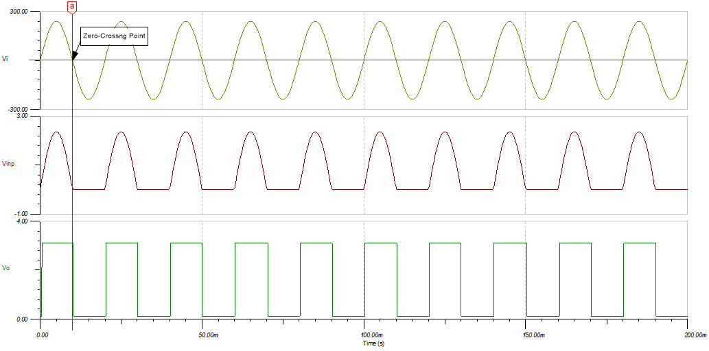 當(dāng)交流輸入超過(guò)零基準(zhǔn)電壓時(shí),過(guò)零檢測(cè)器電路會(huì)改變比較器的輸出狀態(tài)。這是通過(guò)將比較器反相輸入設(shè)置為零基準(zhǔn)電壓,并將衰減輸入施加到同相輸入來(lái)實(shí)完成的。分壓器 R1 和 R2 會(huì)使輸入交流信號(hào)衰減。二極管 D1 用于確保同相輸入永遠(yuǎn)不會(huì)低于比較器的負(fù)輸入共模限值。過(guò)零檢測(cè)通常用于電源控制電路。