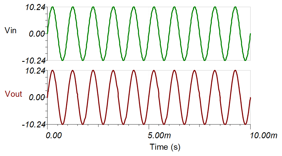 使用 ±10.24V 差分輸入和 7.75V 共模電壓對 INA828 器件進行了仿真。以下 TINA 仿真顯示了 INA828 器件的差分輸入和單端輸出。
