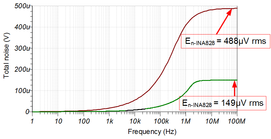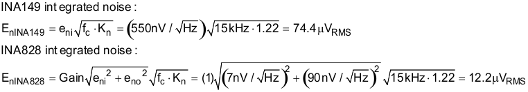 該部分提供了 INA149 和 INA828 器件的簡化噪聲計算。仿真結(jié)果與計算結(jié)果非常接近。有關放大器噪聲計算的詳細理論,請參閱運算放大器:噪聲 4;有關數(shù)據(jù)轉(zhuǎn)換噪聲,請參閱計算 ADC 系統(tǒng)的總噪聲。