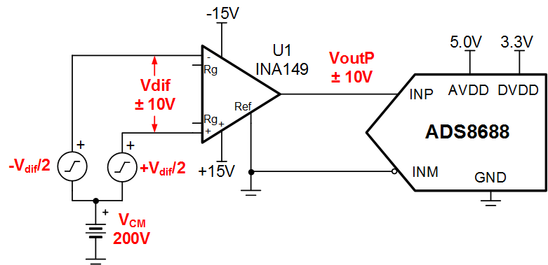 使用 ±10.24V 差分輸入和 275V 共模電壓對 INA149 器件進行了仿真。以下 TINA 仿真顯示了 INA149 器件的差分輸入和單端輸出。該器件沒有 200V 共模電壓問題。