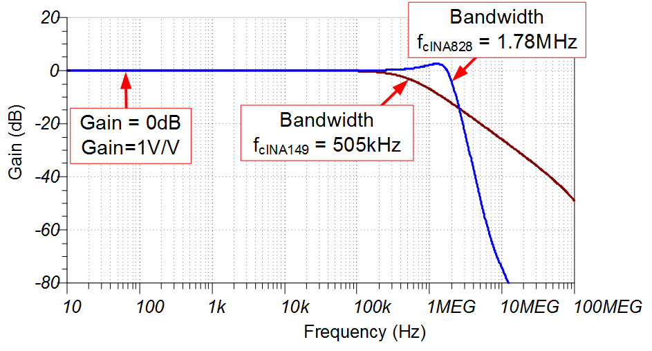 當增益 = 1V/V(或 0dB)時,INA149 器件的仿真帶寬是 505kHz。當增益為 0dB 時,INA828 器件的仿真帶寬是 1.78MHz。這兩個仿真帶寬都非常符合各自的數(shù)據(jù)表。請觀看放大器帶寬視頻系列,了解有關該主題的更多詳細信息。