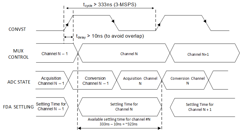 下圖顯示了 ADC 轉(zhuǎn)換控制 (CONVST) 和多路復(fù)用器通道控制時(shí)序。ADS9224R 支持 3Msps 的最大采樣速率或 333ns 的最短周期時(shí)間。為了避免在 CONVST 信號(hào)的上升沿之前切換通道,在 CONVST 上升沿之后的多路復(fù)用器通道控制時(shí)序中實(shí)現(xiàn)了短暫的延遲。有關(guān)該主題的詳細(xì)理論,請(qǐng)參閱 TI 設(shè)計(jì)適用于高電壓輸入的 16 位、400kSPS、四通道多路復(fù)用器數(shù)據(jù)采集系統(tǒng)參考設(shè)計(jì)。