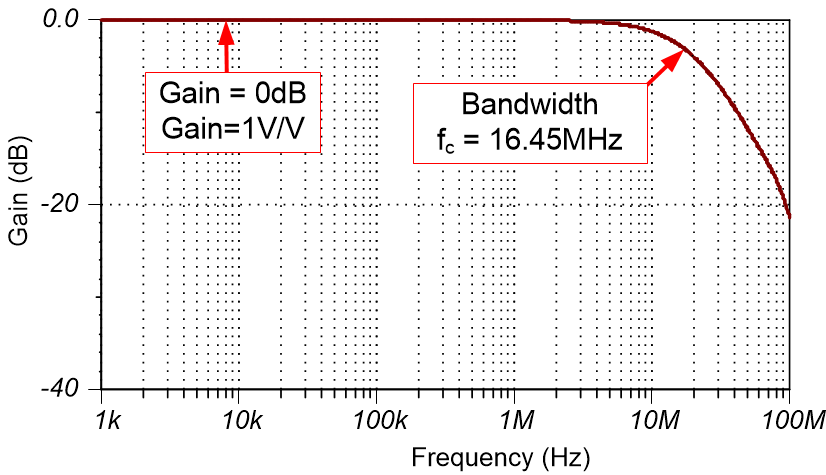 該電路具有 0dB (1V/V) 的增益和 16.45MHz 的仿真頻率帶寬。請(qǐng)注意,計(jì)算的帶寬和仿真的帶寬非常接近(計(jì)算值 = 17.62MHz,仿真值 = 16.45MHz)。有關(guān)帶寬計(jì)算和仿真的總體概述,請(qǐng)觀看運(yùn)算放大器帶寬。