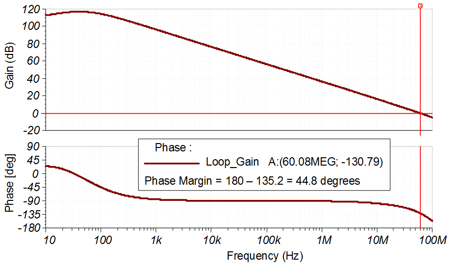 在 TINA 中使用以下電路來測(cè)量環(huán)路增益并在 TINA 中使用交流分析來驗(yàn)證相位裕度。在反饋環(huán)路中使用電阻器 RISO = 10? 來增大相位裕度。該電路具有良好的穩(wěn)定性(大約 45 度的相位裕度)。請(qǐng)觀看運(yùn)算放大器穩(wěn)定性,以了解有關(guān)該主題的詳細(xì)理論。