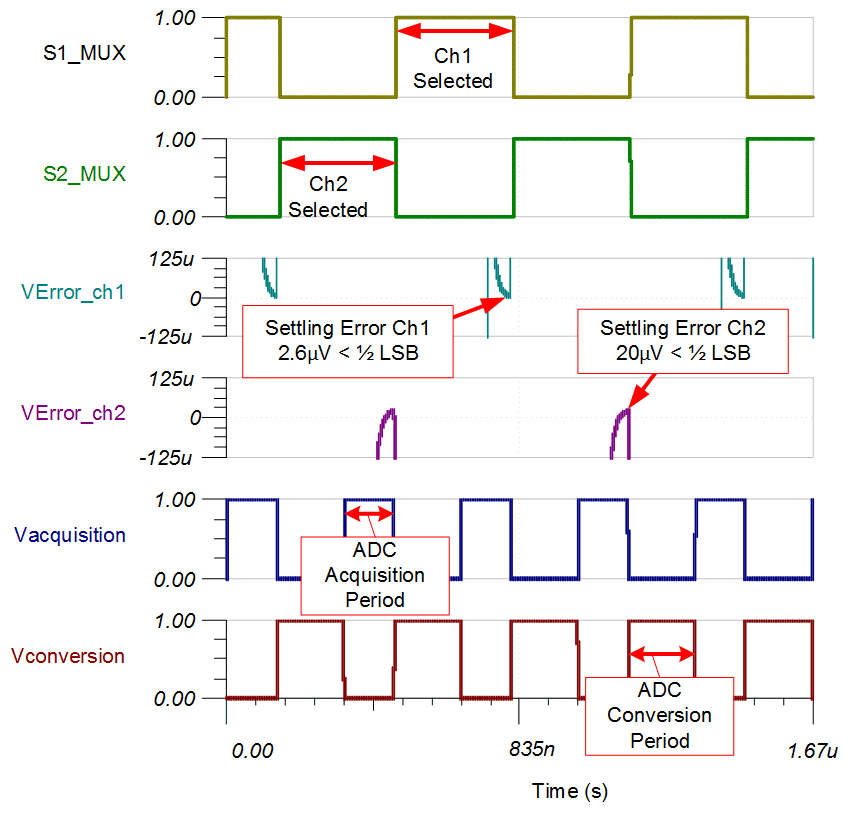 以下 TINA 瞬態(tài)仿真顯示了在相鄰多路復(fù)用器通道之間發(fā)生滿量程階躍變化后 FDA、多路復(fù)用器和 SAR ADC 采樣保持的穩(wěn)定。該類型的仿真表明已正確選擇采樣保持反沖電路和 AFE 放大器電路。請(qǐng)參閱 SAR ADC 前端元件選擇簡(jiǎn)介,了解如何選擇 RC 濾波器以實(shí)現(xiàn)出色的穩(wěn)定和交流性能。