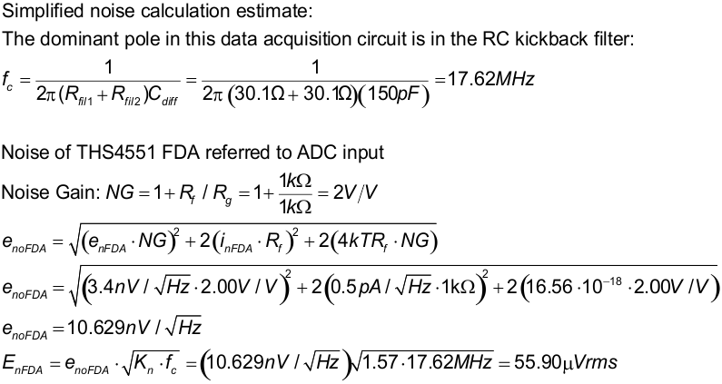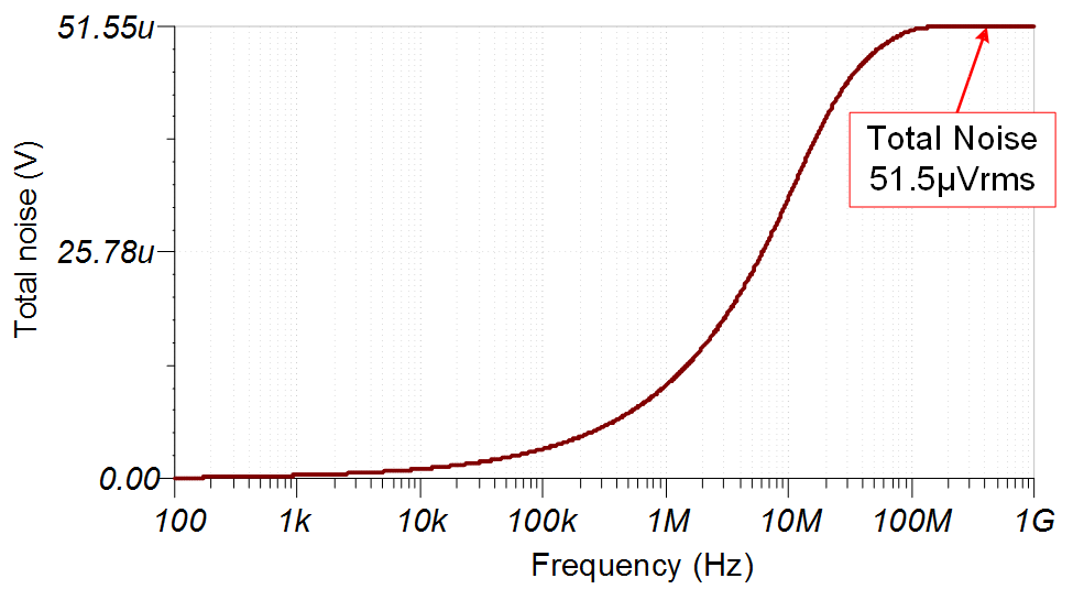 下圖顯示了 FDA 電路的 TINA 仿真總噪聲。請(qǐng)參閱計(jì)算 ADC 系統(tǒng)的總噪聲,了解有關(guān)此主題的詳細(xì)理論。請(qǐng)注意,計(jì)算的噪聲和仿真的噪聲非常接近(計(jì)算值 = 55.9μVrms,仿真值 = 51.5μVrms)。
