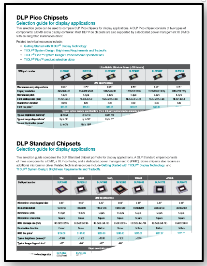 | 如需比較所有現(xiàn)已上市的 DLP 顯示芯片組,請參閱德州儀器 (TI) DLP? 顯示和投影芯片組選擇指南。 | ![]() |