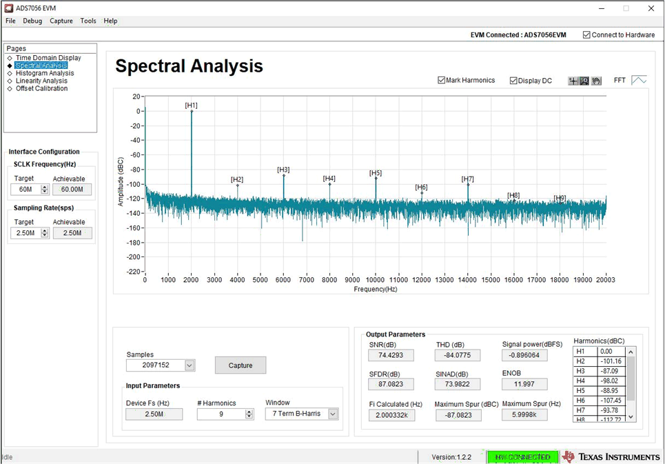 該性能是在 ADS7056EVM 的修改版本上以 2kHz 輸入正弦波測(cè)得的。交流性能顯示 SNR = 74.4dB 且 THD = –84.07dB,這與該 ADC 的額定性能(SNR = 74.9dB 且 THD = –85dB)非常匹配。此測(cè)試是在室溫下進(jìn)行的。有關(guān)此主題的更多詳細(xì)信息,請(qǐng)參閱頻域簡(jiǎn)介。