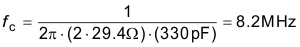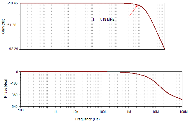 在 –3dB 點(diǎn),模擬的帶寬近似為 7MHz。帶寬受限于 OPA192 器件和 RC 電荷桶電路(Rfilt 和 Cfilt)。如以下公式所示,RC 電路的帶寬為 8.2MHz。OPA192 器件具有 10MHz 的帶寬,這也會(huì)影響電路的總體帶寬。所選的帶寬目標(biāo)是采樣頻率的兩倍,以便確保能夠適當(dāng)?shù)胤€(wěn)定。