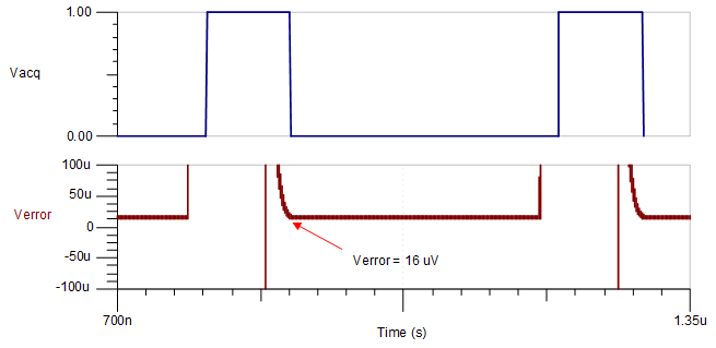 以下仿真顯示了趨穩(wěn)至 9V 直流輸入信號(hào)的情況。這種類型的仿真表明采樣保持反沖電路已正確選擇到 ? LSB (91.5μV) 范圍內(nèi)。請(qǐng)參閱 SAR ADC 前端元件選型簡(jiǎn)介 視頻,了解有關(guān)此主題的詳細(xì)理論。