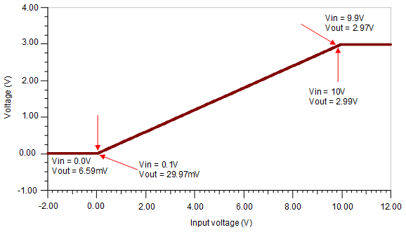 下圖展示了 0V 至 10V 輸入的線性輸出響應(yīng)。該圖顯示了性能在接近 AVDD 和接地時(shí)都有所下降。這是由于元件選型 部分中放大器的線性范圍所致。為了提高這些極端條件下的性能,可以調(diào)整電源,使兩個(gè)放大器的線性范圍都處于 ADC 的滿量程范圍內(nèi)。