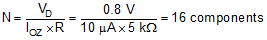 圖 6-2 獨(dú)立總線保持電路 (SN74ACT107x)假設(shè)在實(shí)際應(yīng)用中,總線上驅(qū)動(dòng)器的泄漏電流為 IOZ = 10mA,5kΩ 電阻兩端的壓降為 VD = 0.8V(假設(shè)此值是為了確保達(dá)到定義的邏輯電平)。然后,一個(gè)總線保持電路能夠處理的最大元件數(shù)量可通過 方程式 6 計(jì)算: