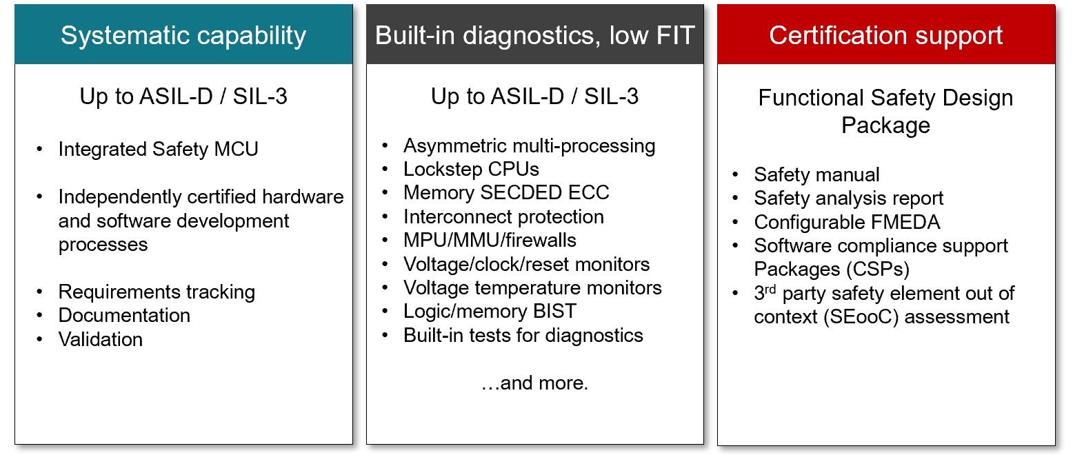 Jacinto SoC 是根據(jù) ISO26262/IEC61508 標(biāo)準(zhǔn)流程開發(fā)的獨立功能安全元素 (SEooC),可實現(xiàn) ASIL-D/SIL-3 等級的系統(tǒng)故障完整性,并包含硬件診斷功能,助力達(dá)到 ASIL-D/SIL-3 等級的隨機故障完整性。該器件已通過經(jīng)認(rèn)證的第三方 (TUV-SUD) 安全評估,可提供證書。