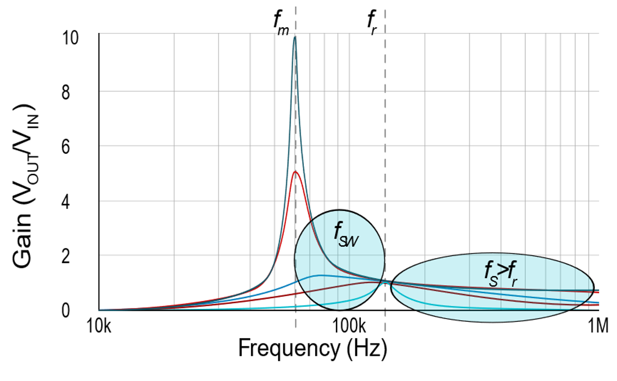 另一方面,第二個(gè)頻率區(qū)間 (fS < fR) 還面臨著增益不足的挑戰(zhàn),這使得 LLC 轉(zhuǎn)換器難以同時(shí)覆蓋低 VIN 和高 VOUT 的工況。通過(guò)正確設(shè)計(jì)具有適當(dāng) Ln (Lm/Lr) 值的變壓器,可以獲得高功率級(jí)增益,因?yàn)檫@定義了可達(dá)到的最大增益。如果變壓器的集成漏電感不足以獲得正確的 Ln 值,則可以添加一個(gè)額外的電感器。