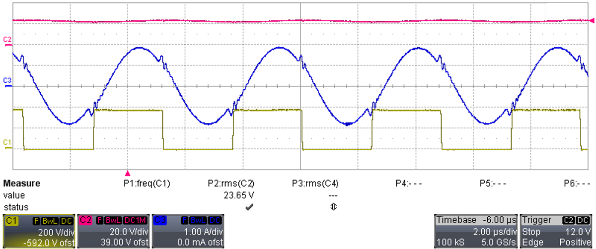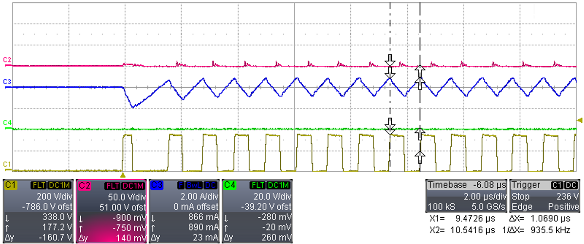 正常運(yùn)行時(shí),開(kāi)關(guān)頻率從 170kHz 變?yōu)?380kHz,因此選擇能夠在該頻率下運(yùn)行并實(shí)現(xiàn)高效率和低損耗的控制器和開(kāi)關(guān)元件是關(guān)鍵所在。突發(fā)模式和軟啟動(dòng)期間,控制器甚至可以達(dá)到 1MHz 頻率,如圖 4-9 所示。借助 TI 的全新控制器 UCC256611 和 GaN 的超高速能力,這將不是問(wèn)題。