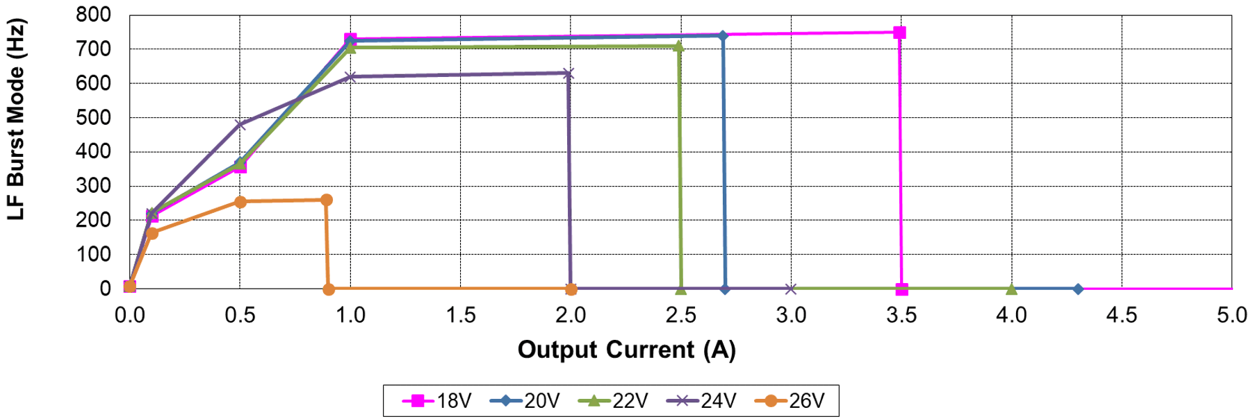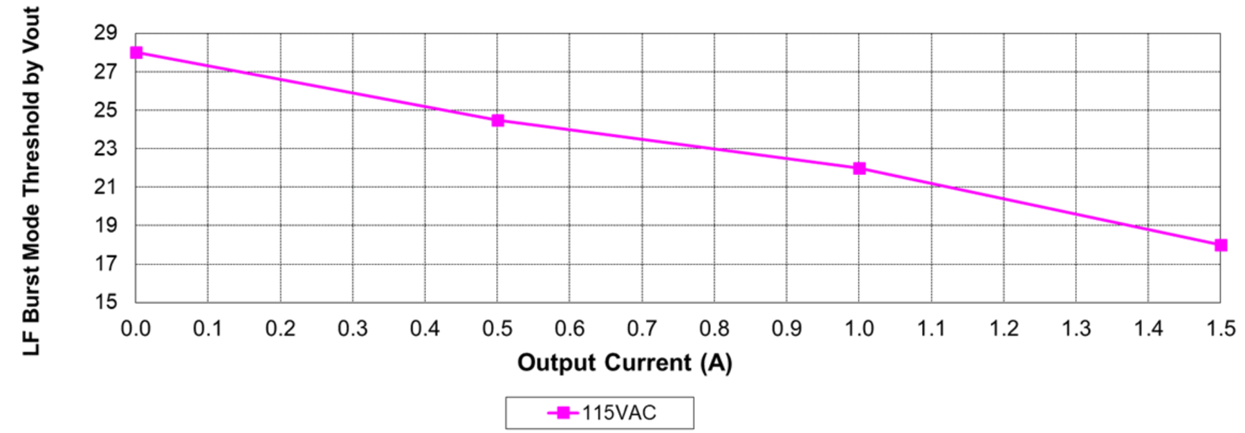 圖 4-7 頻率與 VOUT 間的關(guān)系由于在該設(shè)計(jì)中,低頻突發(fā)模式會(huì)影響峰峰值充電電流紋波,因此我們?cè)诘皖l突發(fā)模式停止且轉(zhuǎn)換器連續(xù)運(yùn)行或在高頻突發(fā)模式運(yùn)行的條件下測(cè)量。下面的圖形顯示了一些閾值(當(dāng)曲線折疊時(shí),此時(shí) LF 突發(fā)關(guān)閉)。