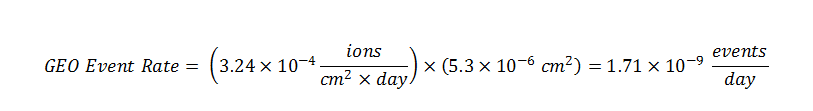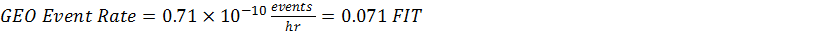 為了演示如何計算事件發(fā)生率,假設(shè)您希望為截面如 圖 1-2 所示的器件計算 GEO 軌道的事件發(fā)生率。使用 圖 1-1 中的紅色曲線和從 圖 1-2 獲得的起始入射 LET 值(約為 65MeV-cm2/mg),您會發(fā)現(xiàn) GEO 積分通量約為 3.24 × 10–4 個離子/cm2/天。事件發(fā)生率是積分通量和 圖 1-2 中飽和截面的乘積(約為 5.3 x 10-6cm2):