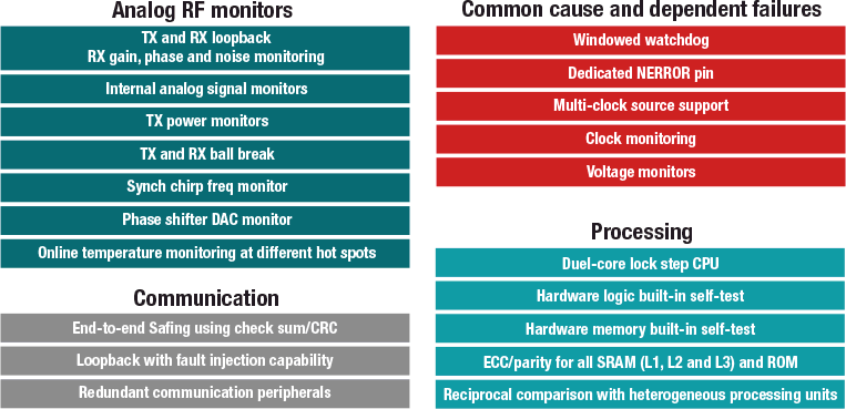 這種非接觸式傳感器解決方案必須實(shí)現(xiàn)功能安全,才能幫助更大程度降低與可能導(dǎo)致人身傷害、環(huán)境污染或財(cái)產(chǎn)損失的潛在危險(xiǎn)故障相關(guān)的風(fēng)險(xiǎn)。TI 設(shè)計(jì)的毫米波雷達(dá)傳感器可幫助解決此類難題。從功能安全的角度來看,TI 在開發(fā) IWR6843 等毫米波器件之前,已進(jìn)行了大量的硬件和軟件開發(fā)工作,并獲得了 Technischer überwachungsverein (TüV) SüD 的器件認(rèn)證。如圖 2 所示,IWR6843 傳感器還內(nèi)置多種功能安全機(jī)制,這些機(jī)制提供國(guó)際電工委員會(huì) 61508 所要求的必要診斷覆蓋范圍,可在元件級(jí)別滿足高達(dá)安全完整性等級(jí) (SIL) 2 的隨機(jī)硬件功能。