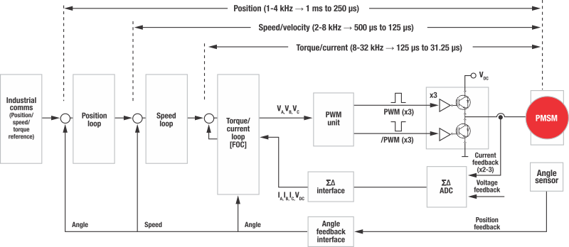 在伺服電機(jī)驅(qū)動(dòng)應(yīng)用中,電機(jī)控制通常分為幾個(gè)控制環(huán)路層:電流/扭矩環(huán)路、速度環(huán)路、位置環(huán)路和更高級(jí)別的運(yùn)動(dòng)控制環(huán)路。這些環(huán)路通常以級(jí)聯(lián)的形式排列,每個(gè)環(huán)路都有自己的“實(shí)時(shí)”處理要求。電流或扭矩環(huán)路是超嚴(yán)苛的控制環(huán)路。每個(gè)上游環(huán)路以其之前環(huán)路的倍數(shù)運(yùn)行,并為下游環(huán)路提供輸入?yún)⒖肌?a xmlns:opentopic="http://www.idiominc.com/opentopic" class="xref" href="#GUID-4090ACD4-52C1-4932-A6C4-6BDD39A4B271">圖 1 顯示了典型的級(jí)聯(lián)控制拓?fù)洹?/p>